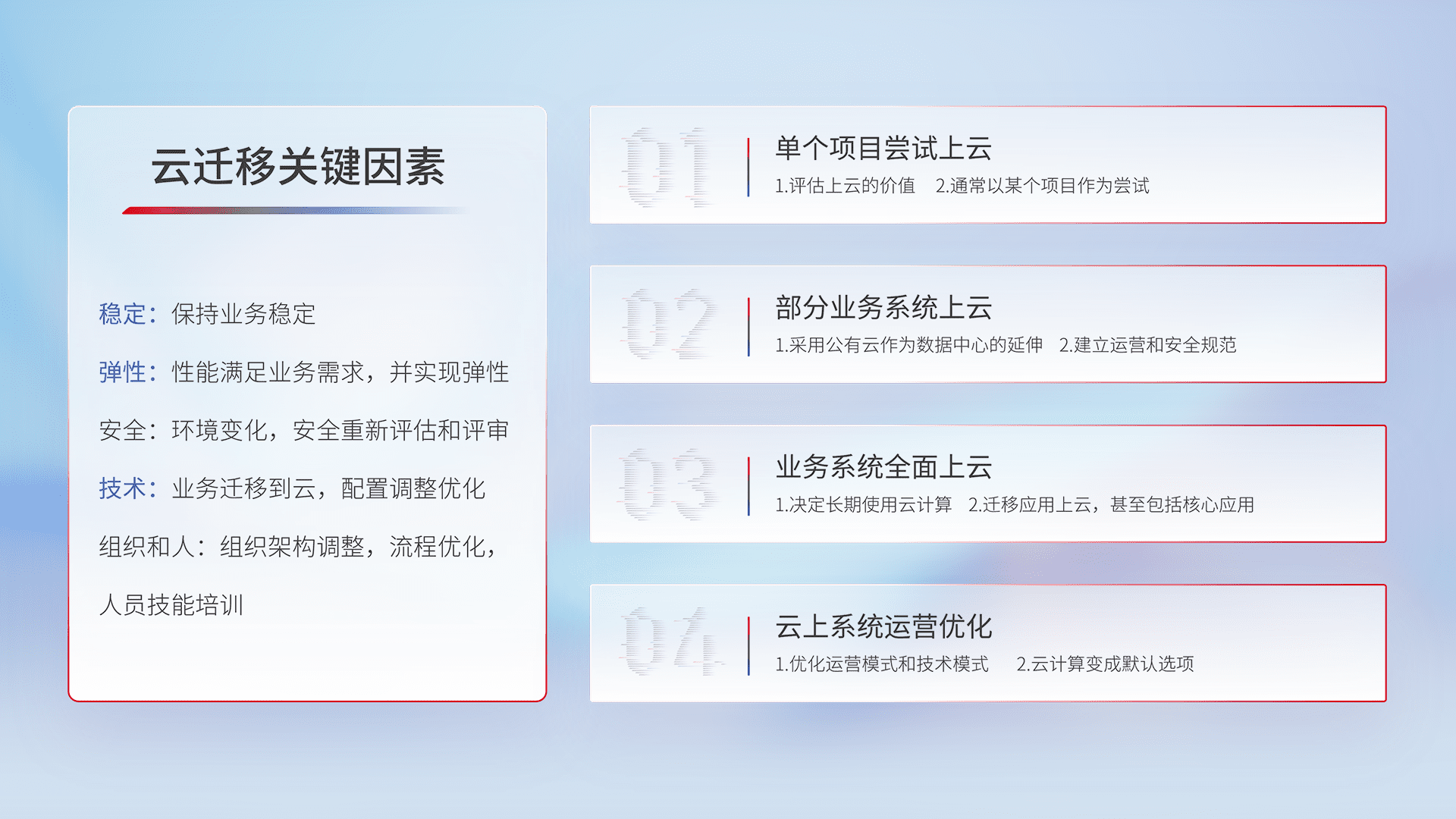 结合实际业务,,,从规划设计、、、、云平台选型、、云原生改造、、、数据迁移、、、集成交付,,,迁移全过程为客户识别最佳上云路径,,,,做好风险识别管理,,,设计网络架构、、身份权限、、安全审计合规、、操作审计、、、日志审计、、监控告警策略、、多站点容灾设计等,,对云上基础设施进行整体规划,,提升IT治理水平,,,以满足弹性、、、、高可用、、高性能的需求。。